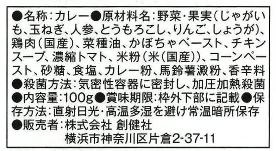 原材料 | 野菜・果実(じゃがいも、玉ねぎ、人参、とうもろこし、しょうが)(国産)、鶏肉(国産)、菜種油(オーストラリア)、かぼちゃペースト(国産)、チキンスープ(国産)、濃縮トマト(国産)、米粉(米(国産))、コーンペースト(国産)、りんご(国産)、砂糖(鹿児島)、食塩(沖縄)、カレー粉、馬鈴薯澱粉(国産)、香辛料 |