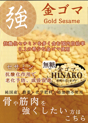 | 原材料 | 無糖タイプ:八天狗大豆(熊本県産)、金ゴマ(宮崎県産)黒糖入りタイプ:八天狗大豆(熊本県産)、黒糖(沖縄県産)、金ゴマ(宮崎県産) |